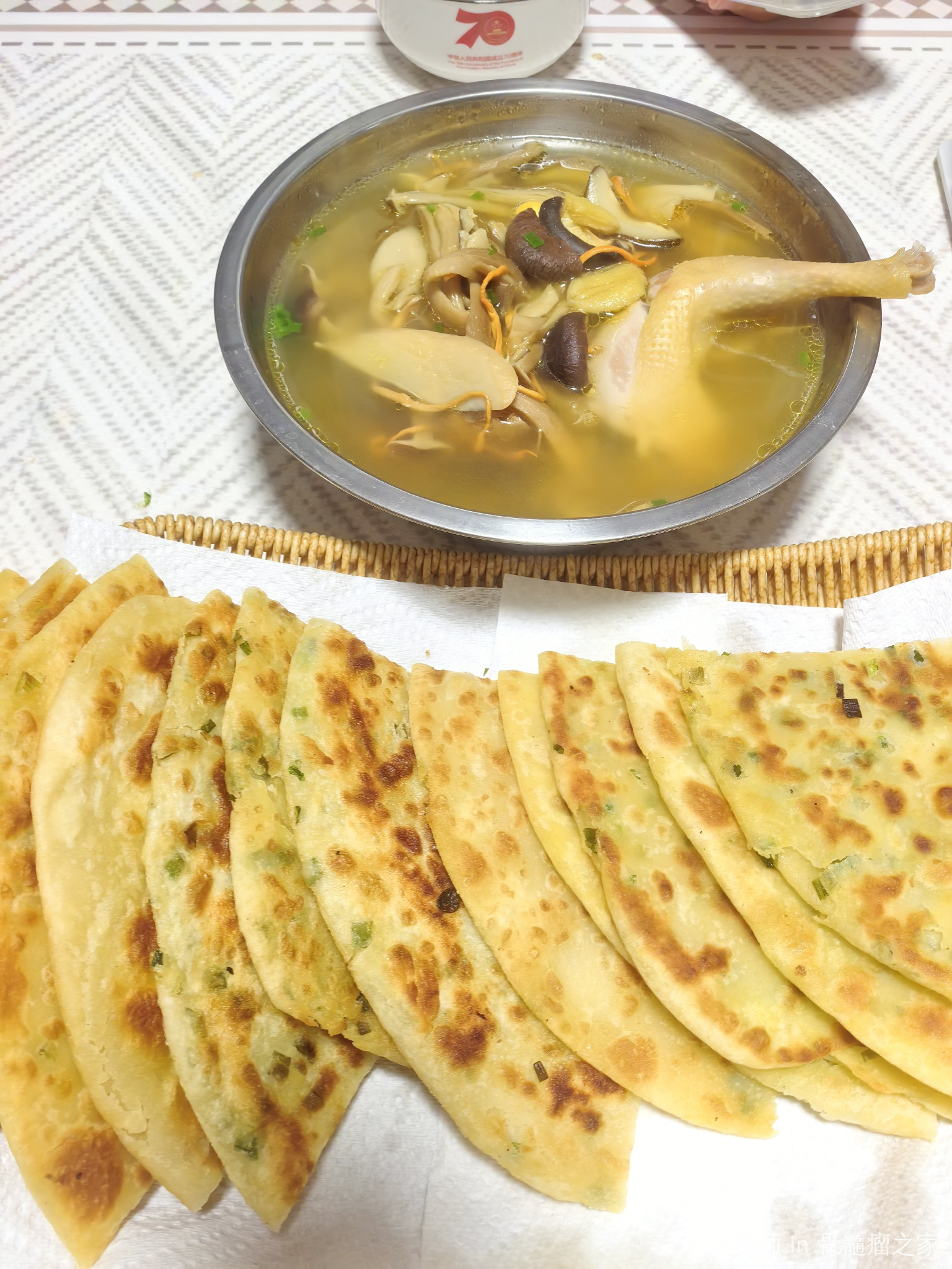 大姑姐上班路过,一大早把一只处理干净的母鸡,鸡蛋放门口了。晚上就加工了葱油饼和母鸡菌菇汤,简简单单又是一餐~~~
